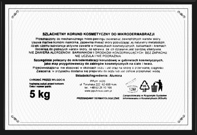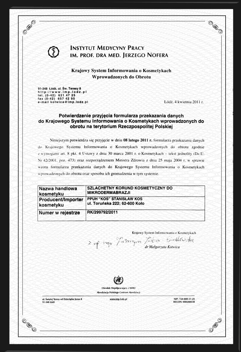Zgodnie z Rozporządzeniem Unii Europejskiej 1223/2009 Korund do Mikrodermabrazji firmy KOS jest certyfikowany według nowej oceny bezpieczeństwa i został zarejestrowany w Europejskim Systemie Rejestracji Kosmetyków (Cosmetic Products Notification Portal - CPNP) pod numerem 1635781.